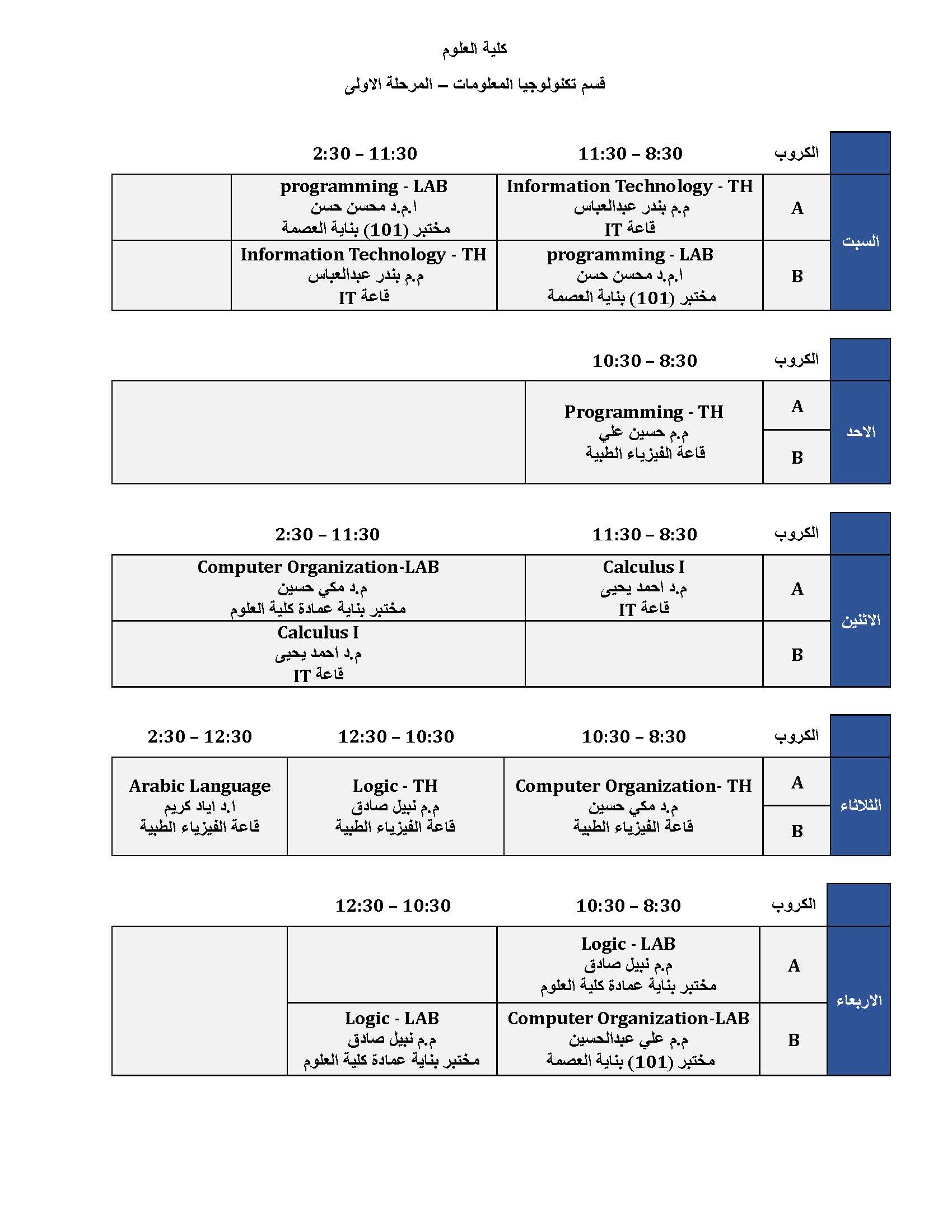 الجدول الأسبوعي لطلبة المرحلة الأولى قسم تكنولوجيا المعلومات