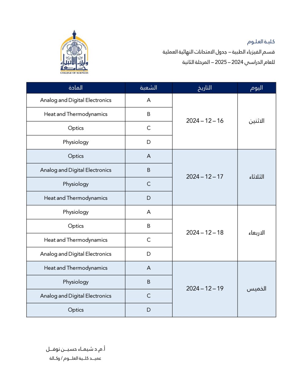 الجدول النهائي للإمتحان العملي النهائي لقسم الفيزياء الطبية