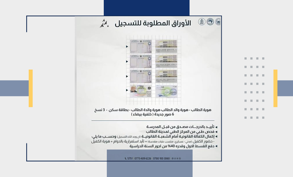 المستمسكات المطلوبة للتسجيل: