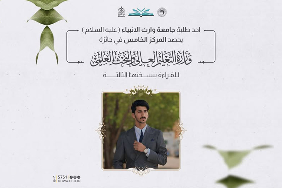 حقق الطالب برير مزهر أحمد عطية من كلية القانون والعلوم السياسية في جامعة وارث الأنبياء (عليه السلام)، المرتبة الخامسة في جائزة وزارة التعليم العالي والبحث العلمي للقراءة – النسخة الثالثة، ضمن مشاركة واسعة من طلبة الجامعات العراقية.