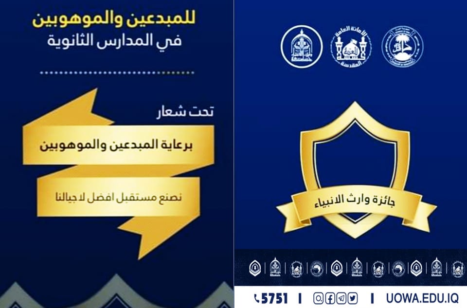 تشجيعا للطلبة الموهوبين والمبدعين على المزيد من الإبداع وتطوير قابلياتهم، وبتوجيه من المتولي الشرعي للعتبة الحسينية المقدسة سماحة الشيخ عبد المهدي الكربلائي(دام عزه) ،وبرعاية رئيس الجامعة الاستاذ الدكتور ابراهيم الحياوي، وبالتعاون مع المديرية العامة لتربية محافظة كربلاء المقدسة، اعتزمت الجامعة إطلاق جائزة الموهوبين والمبدعين من طلبة المدارس الثانوية لمحافظات كربلاء وبابل والنجف والديوانية وبغداد.