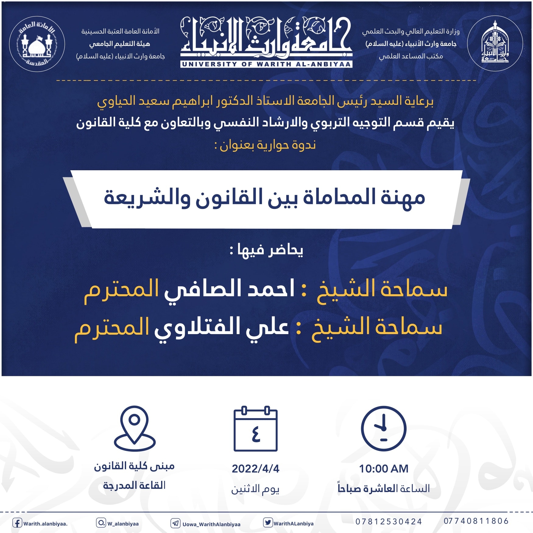 برعاية رئيس الجامعة الاستاذ الدكتور ابراهيم الحياوي أقام التوجية التربوي والارشاد النفسي وبالتعاون مع كلية القانون ندوة حوارية بعنوان " مهنة المحاماة بين القانون والشريعة "