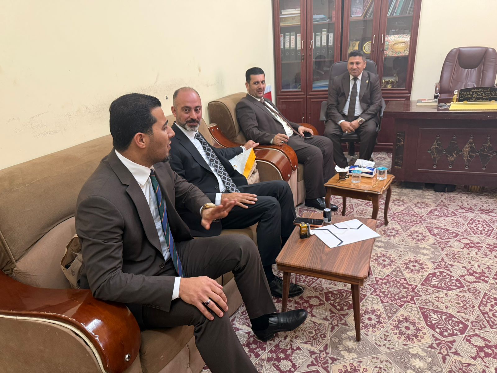A delegation from the Faculty of Media at Al-Waritheen University, affiliated with the Holy Hussein Shrine, discussed with the deanship of the Faculty of Media at Thi Qar University the latest developments in the field of media, artificial intelligence, and joint evaluation exams