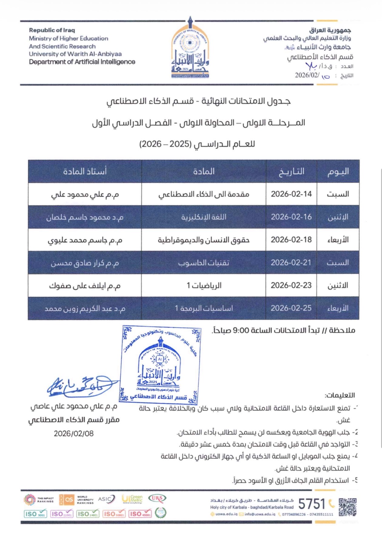 Final Examination Schedule / First Stage – First Attempt – First Semester 2025–2026