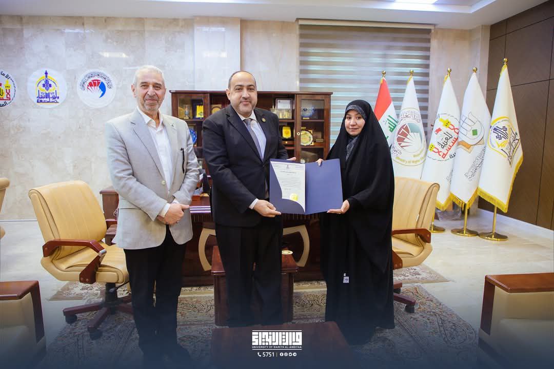 The Presidency of Warith Al-Anbiya University, represented by its President, Dr. Ibrahim Al-Hayawi, honored Dr. Noor Al-Saadi, a professor at the College of Islamic Sciences, on the occasion of her promotion to the rank of professorship, in recognition of her scientific efforts.