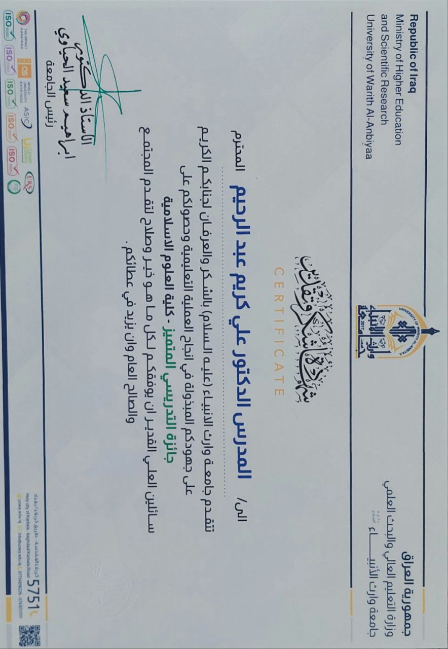 Assistant Lecturer Ali Karim Abdul Rahim, a lecturer at the College of Islamic Sciences at Warith Al-Anbiya University, received the Distinguished Lecturer Certificate from the University Presidency, during a ceremony held by the university to honor distinguished lecturers on Tuesday 10/1/2024 in the presence of the University President, Professor Dr. Ibrahim Saeed Al-Hayawi, the University President's Assistants, the Deans of the Colleges, and a number of lecturers.