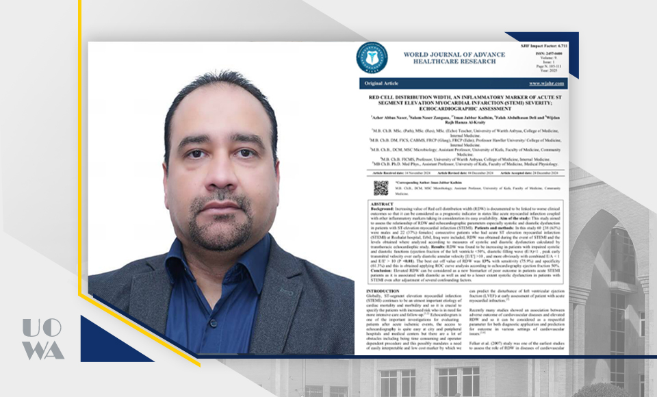 Recently, a new scientific research by Dr. Azhar Abbas Nasser, a lecturer at the College of Medicine - Warith Al-Anbia University, was published in the World Journal of Advance Healthcare Research, in which he discussed the presentation of red blood cell distribution width (RDW) as an inflammatory indicator of the severity of acute myocardial infarction (STEMI), using echocardiographic assessment.