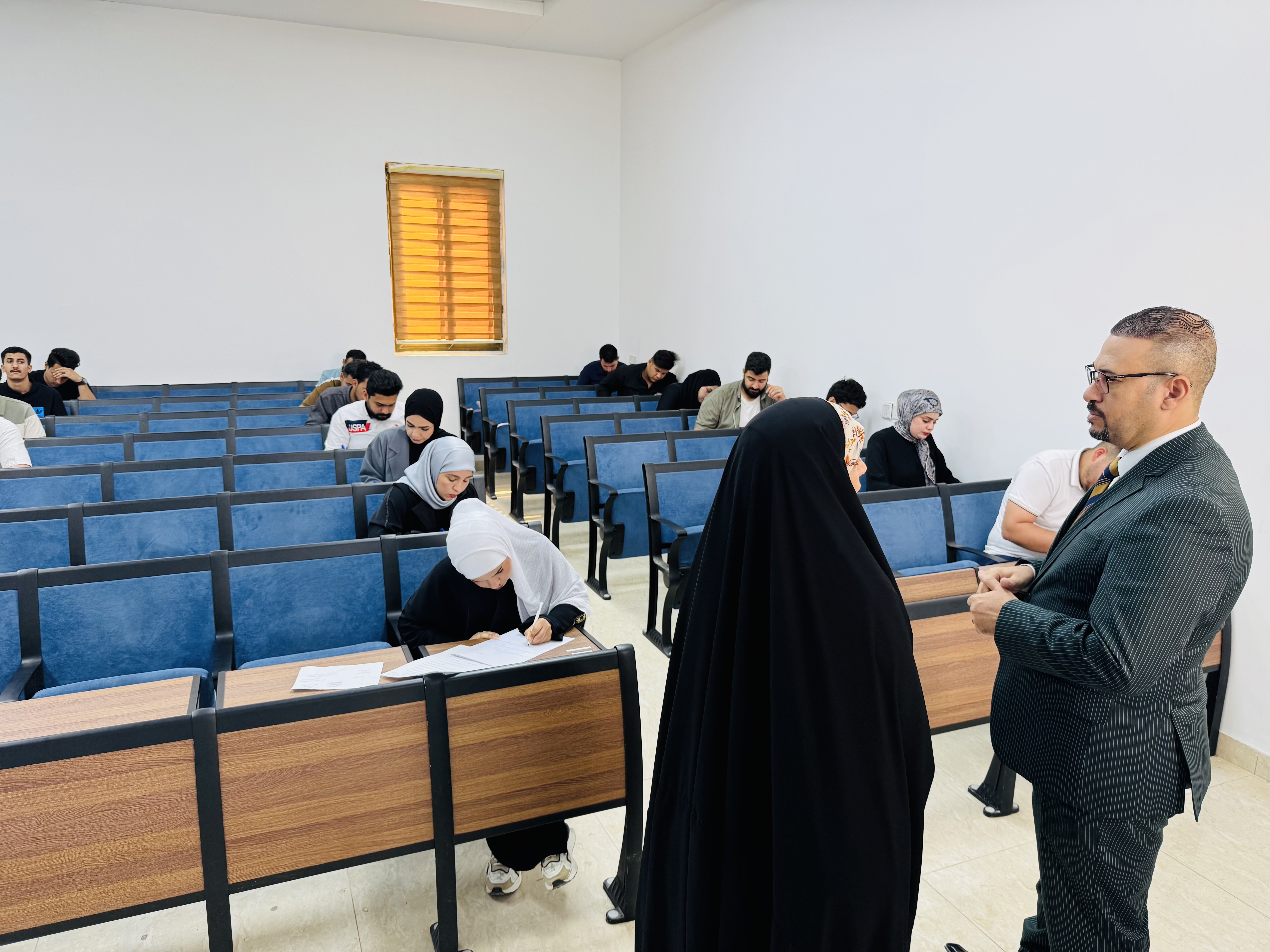 The Deanship of the College of Nursing, headed by Professor Dr. Murtadha Al-Jubouri, Dean of the College, and attended by the Administrative and Scientific Assistant conducted an inspection tour of the examination halls on the first day of the first-term exams for the second semester. This tour comes within the framework of monitoring the orderly and efficient conduct of the exams and providing a suitable environment for students. During the tour, the availability of all necessary exam supplies was verified. These steps reflect the Deanship's attention to detail and its commitment to providing a distinguished examination experience for students