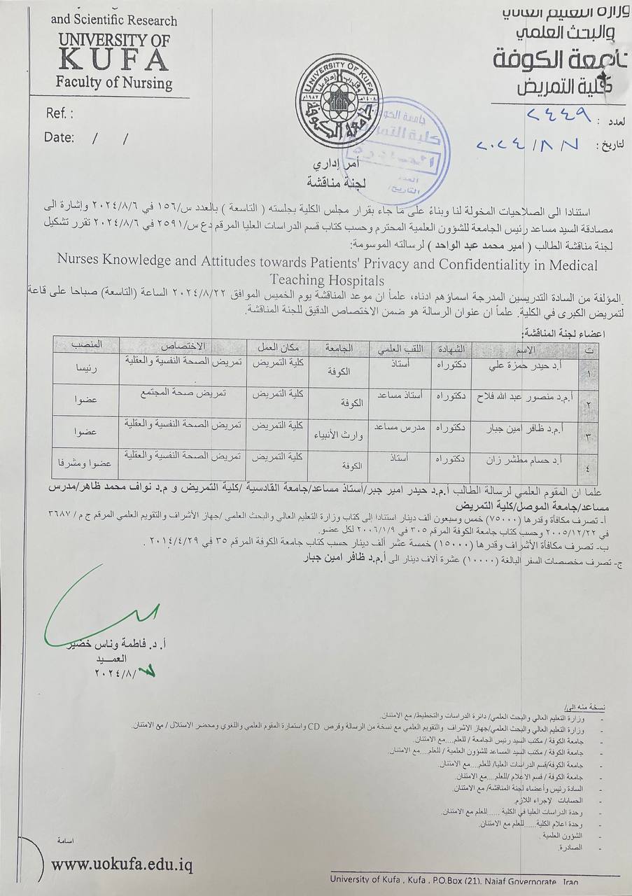 Assistant Professor Dr. Haider Mohammed Ali participated as a committee member in a master’s thesis defense at the University of Karbala.