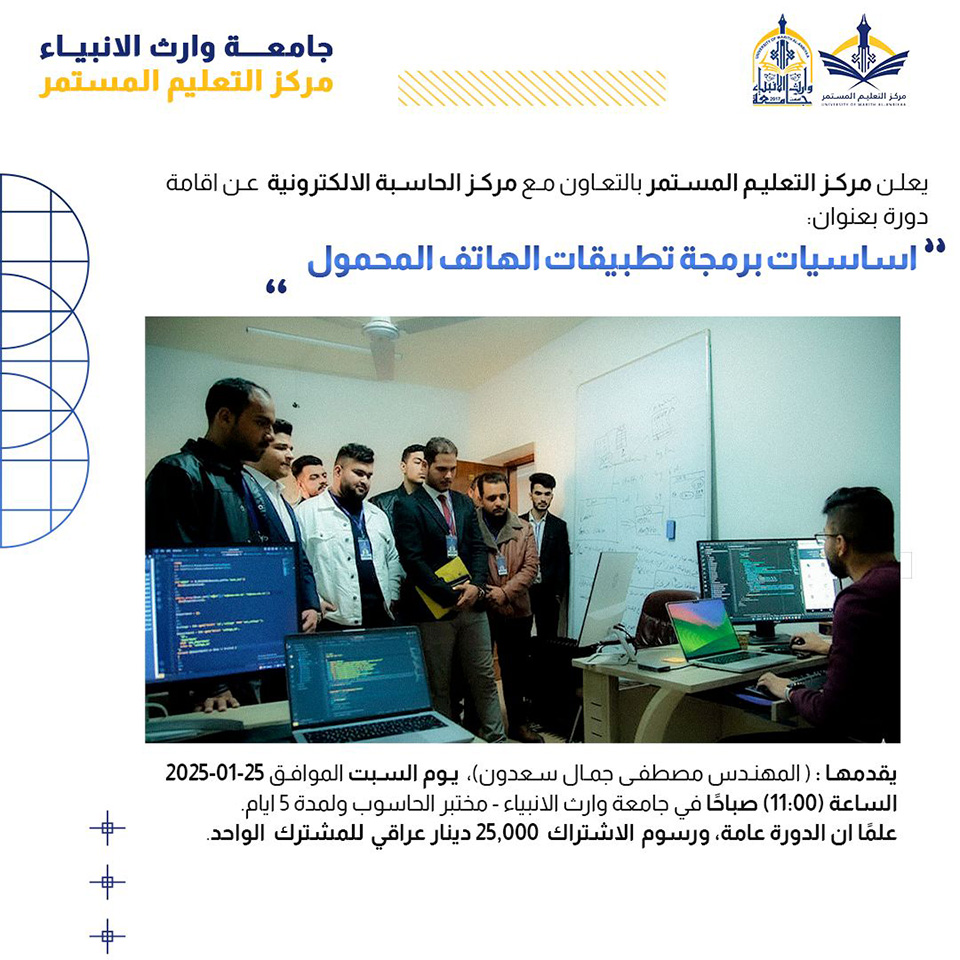 The Continues Education Centre at the University of Warith Al-Anbiyaa is pleased to announce the opening of registration for the Mobile Application Programming Basics Course, set to begin on January 25, 2024. The course will be conducted by Engineer Mustafa Jamal Saadoun.